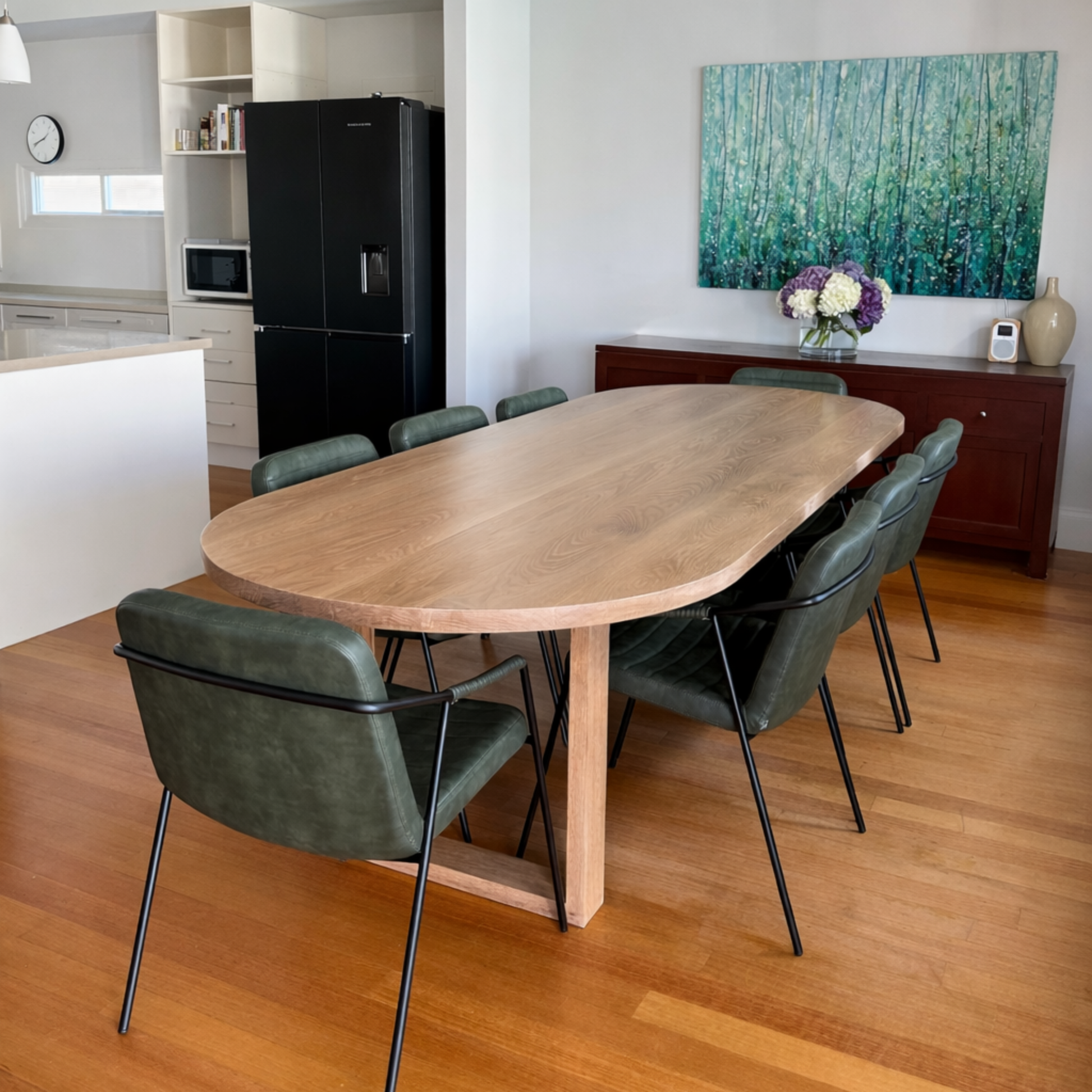 Introducing the Bel Air, a distinctive dining table featuring a solid tabletop with semi-circle rounded ends, mounted on solid timber loop legs.
