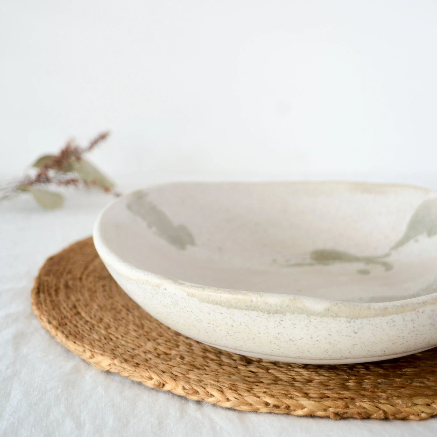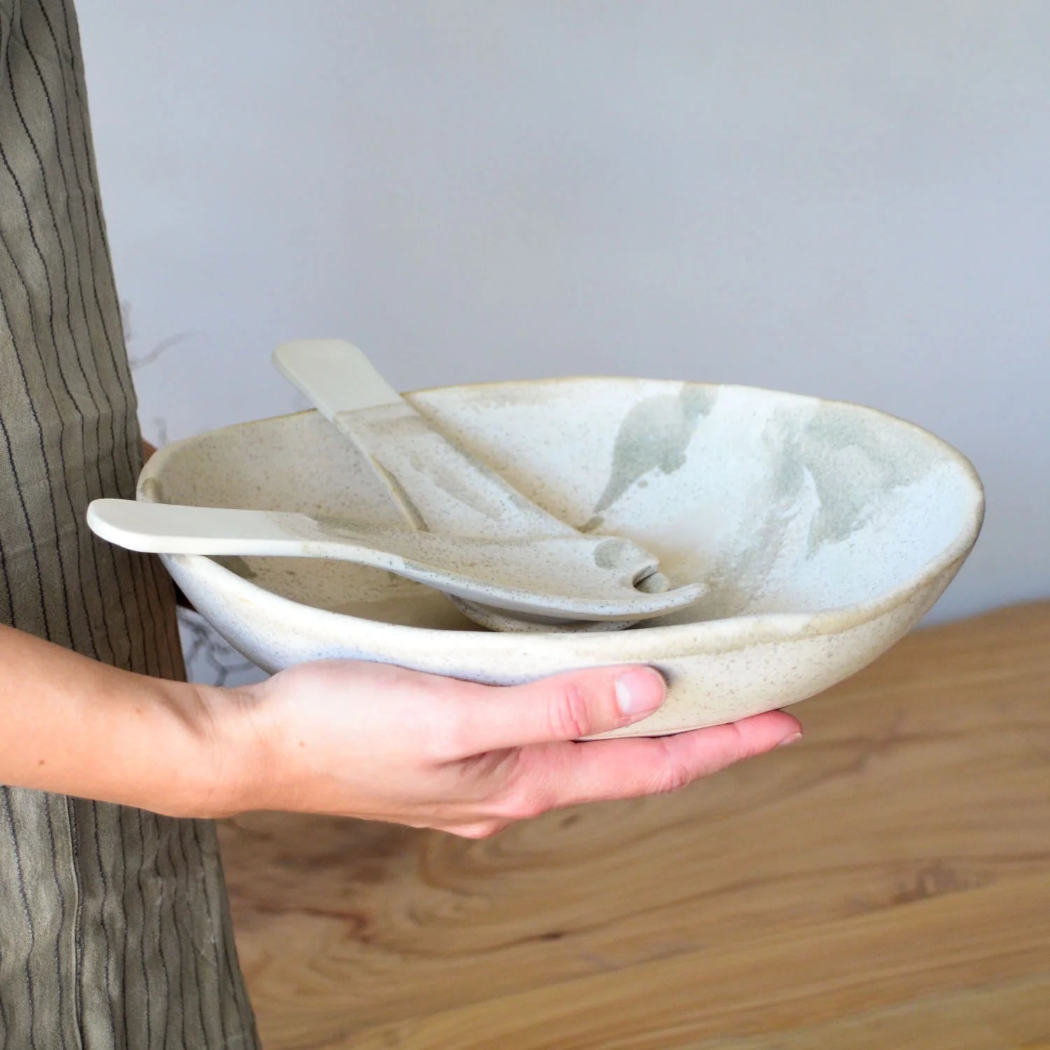 The surface of each piece is hand-brushed with a non-toxic, food-safe white gloss glaze, leaving the edges and base of the bowl with a vitrified stone-like surface with a tactile feel, showcasing the beauty of this lightly speckled stone coloured clay.